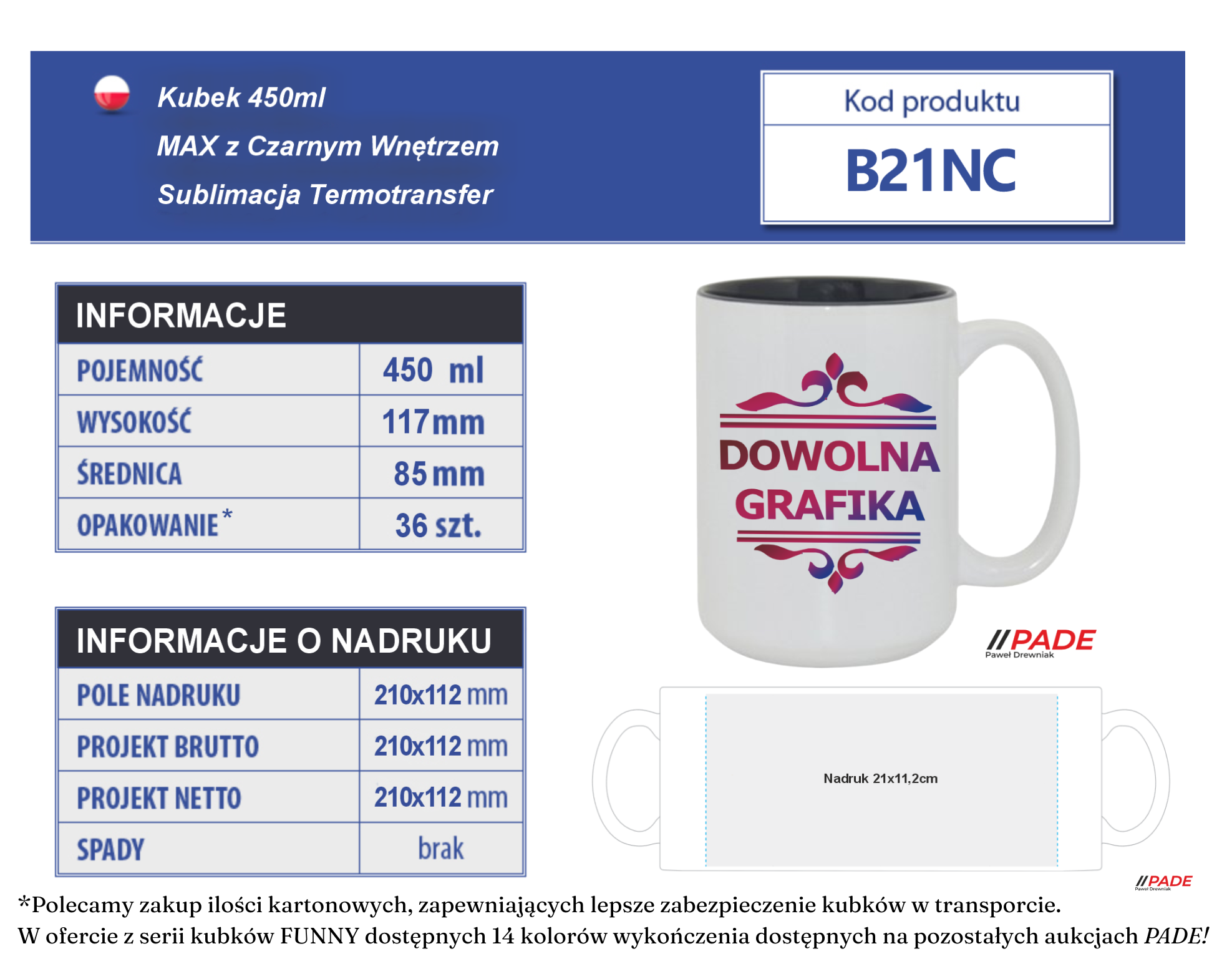 Stwórz unikalny kubek z czarnym wnętrzem i własnym nadrukiem, który wyrazi Twoją osobowość i doda energii każdemu porankowi! Wybierz swój ulubiony wzór, tekst lub grafikę, aby zaprojektować kubek, który będzie wyróżniał się na tle innych. Wykonany z wysokiej jakości ceramiki, kubek z czarnym wnętrzem jest nie tylko stylowy, ale również trwały, a intensywny kolor zapewnia doskonałą prezentację nadruku.