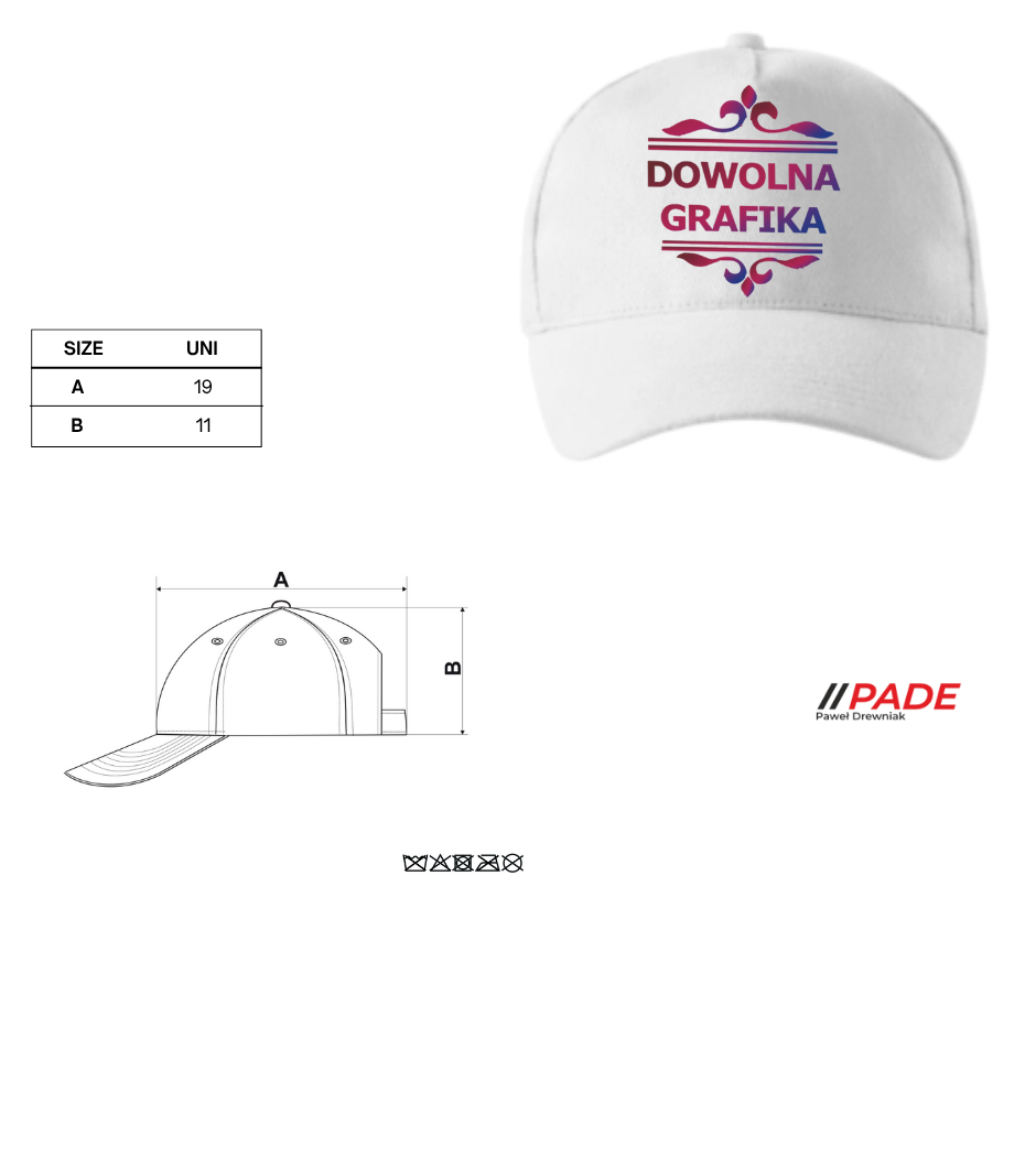 Wizualizacja czapki oraz nadruku wysyłana w wiadomości zwrotnej, w celu zatwierdzenia położenia wzoru ma charakter poglądowy i stanowi jedynie ilustrację rzeczywistego wyglądu produktu  Rzeczywisty rozmiar nadruku jest uzależniony również od wybranego modelu czapki.