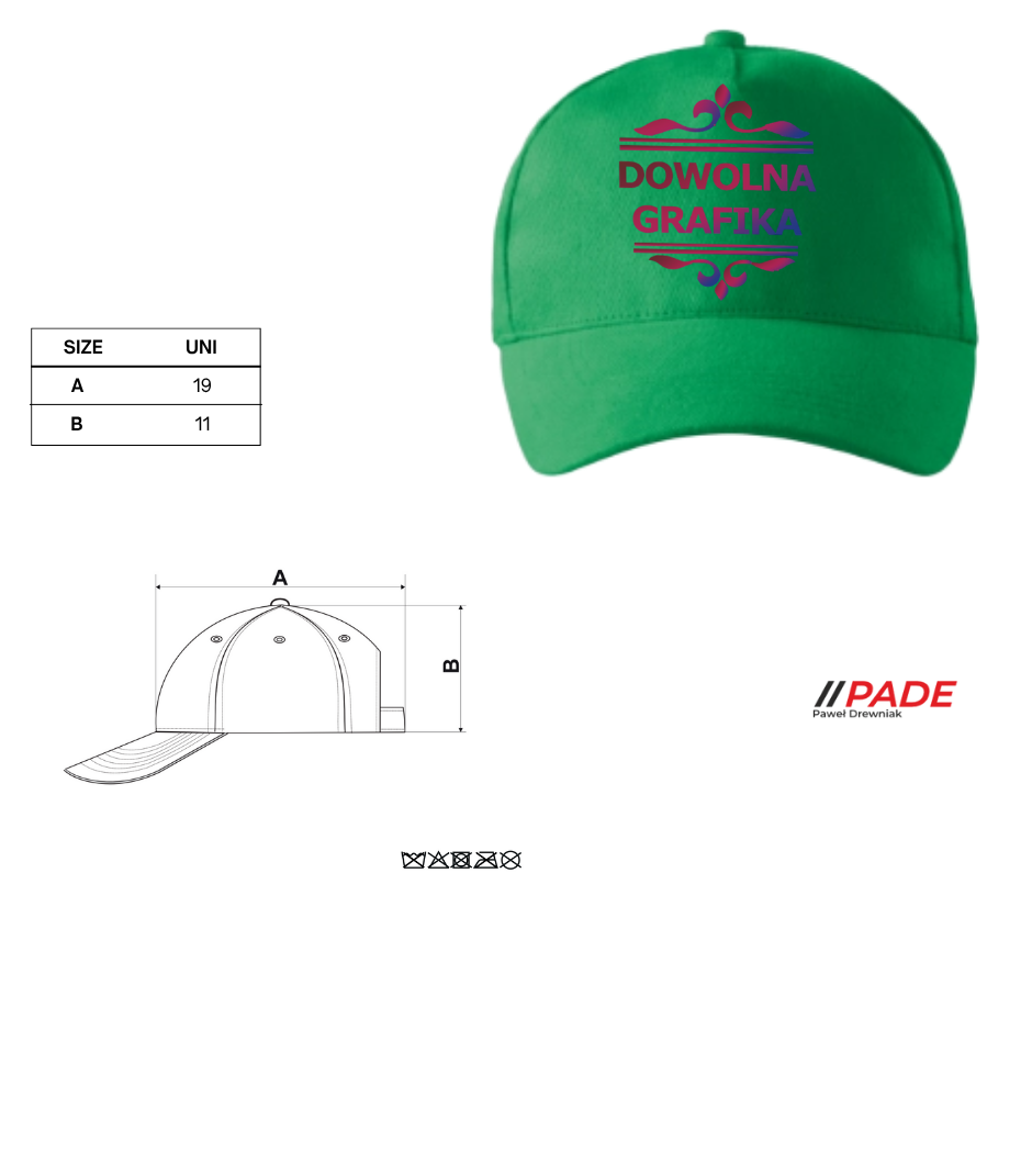 Wizualizacja czapki oraz nadruku wysyłana w wiadomości zwrotnej, w celu zatwierdzenia położenia wzoru ma charakter poglądowy i stanowi jedynie ilustrację rzeczywistego wyglądu produktu  Rzeczywisty rozmiar nadruku jest uzależniony również od wybranego modelu czapki.